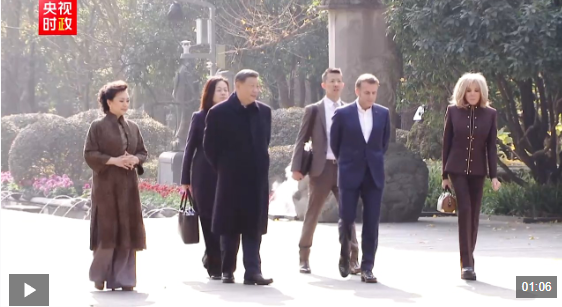 初冬的都江堰,苍山掩翠。马克龙夫妇抵达时,受到习近平和彭丽媛热情迎接。两国元首夫妇沿堰功道边走边谈。习近平介绍都江堰历史和意义,指出都江堰水利工程是全世界迄今唯一仍在使用的古代水利工程,也是人类与自然和谐共生最早的成功实践之一,修建过程充分反映了中华民族自强不息、不畏艰难、勇于开拓的精神。两国元首夫妇落座怀古亭,临水品茗,纵论天下。