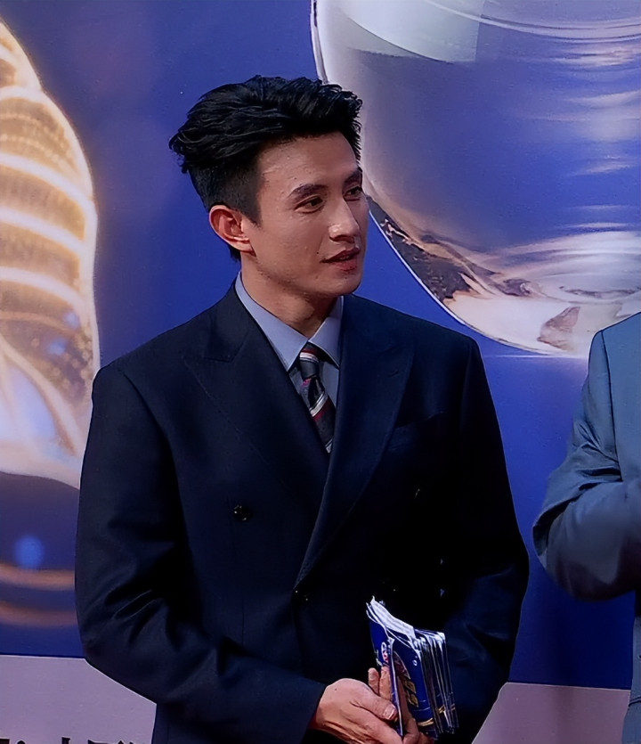 他穿了件深V西装,本来想走型男路线,结果那卷发梳得过于规整,说句实在的,有点像咱们小区大姨烫的款式,显得特别违和。