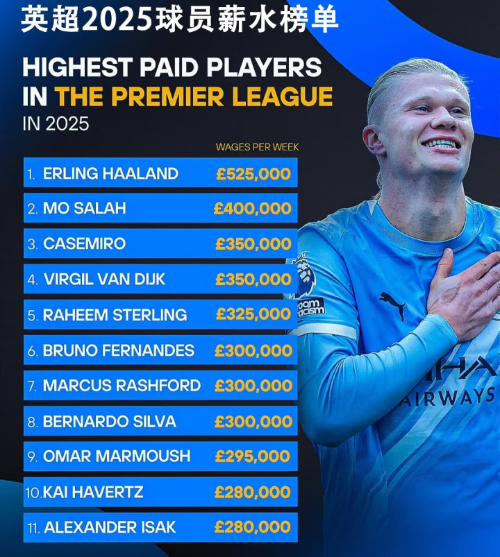 这一数字让格伊成为曼城队内第二高薪球员,与队长B席并列,仅次于周薪52.5万英镑的哈兰德。对比格伊在水晶宫5万英镑的周薪,他的收入一下子上涨了5倍。